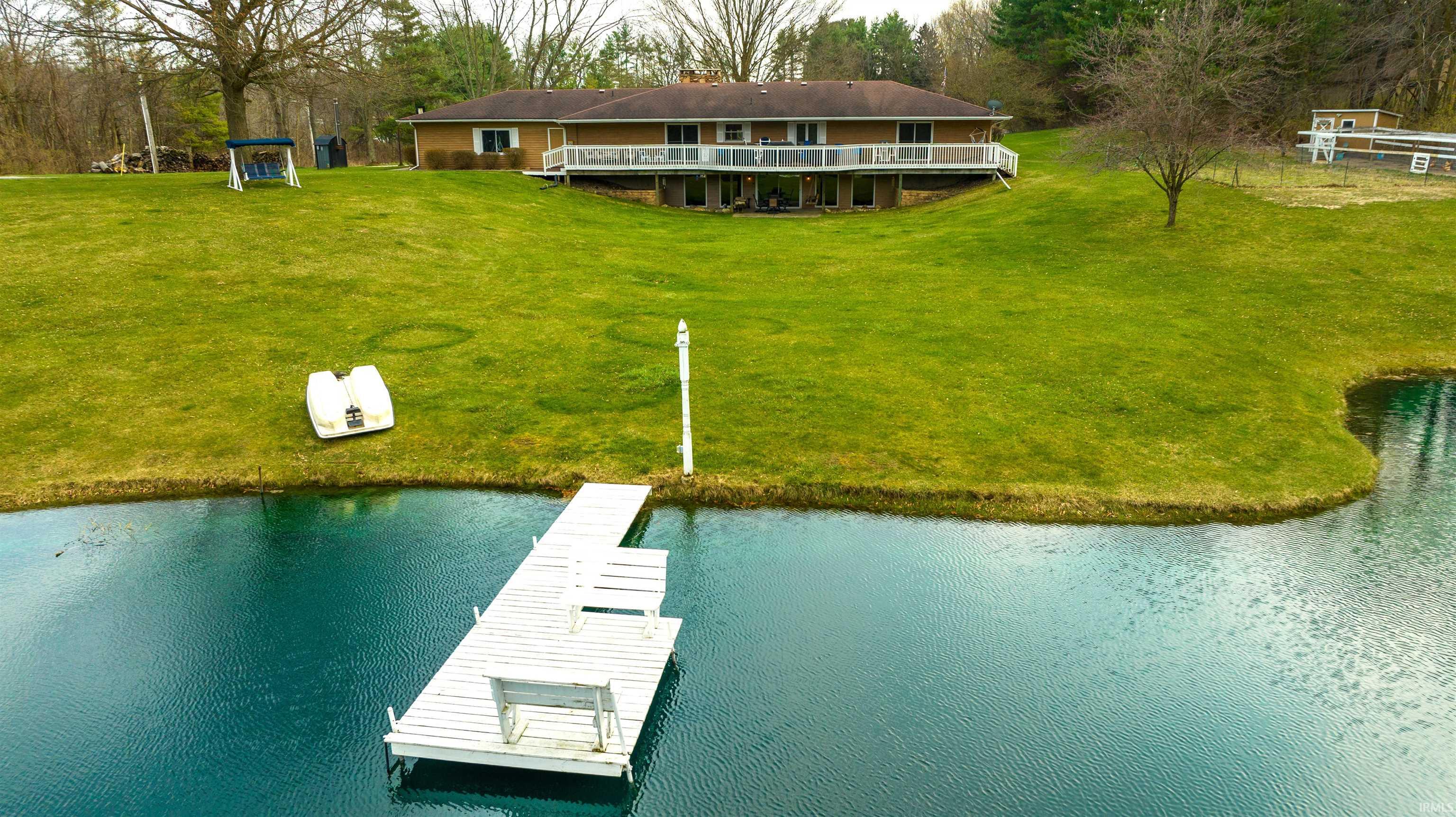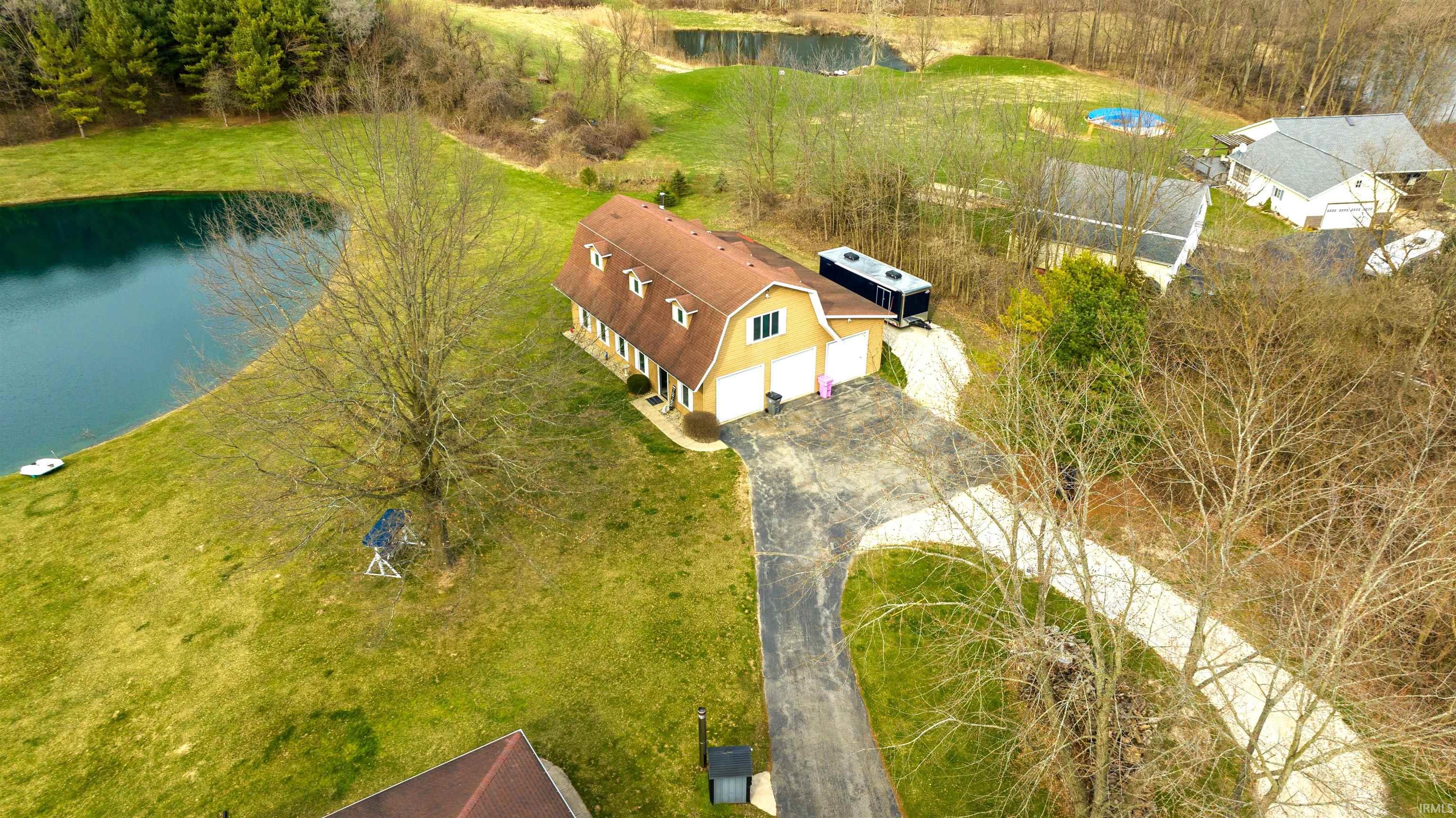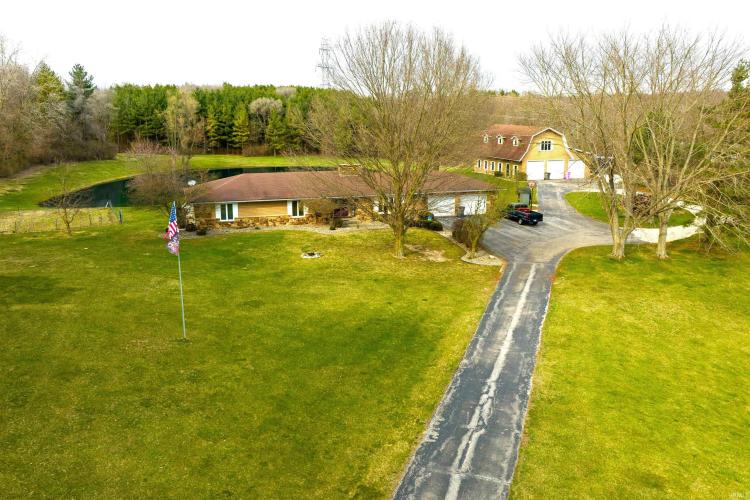 Don't miss out on this sprawling 4000 sq. ft. walk-out ranch built nestled on over 19 acres of serene Indiana countryside with two large ponds and an incredible pole barn! Outdoor enthusiasts will appreciate the endless possibilities this property has to offer with two fully stocked ponds providing you with picturesque views from every room in the house. The main house features 4 spacious bedrooms and 3 full baths on the main floor. The eat-in kitchen boasts an ample amount of cabinets, solid surface countertops, and a stainless steel appliances package. Enjoy outdoor gatherings and seamless hosting with the large deck right off the kitchen. Cozy up to the double-sided natural stone wood-burning fireplace that separates the kitchen from the living room, adding warmth and charm to the space. The lower level includes a walk-out basement with a game/TV area, a bar, 3 additional flex-rooms, a full spa-like bath, and a kitchenette/laundry room. The property also includes a large pole barn with space for 3+ vehicles, boats, or UTVs. The barn is fully equipped with a workshop/office, kitchen, full bath, and a second level featuring additional living space, 2 flex-rooms, and a balcony with stunning views of the property. Additional features include an intercom/audio system, a custom spiral staircase, and a two-car attached garage. This property is ideal for those who love to host, hobbyists, nature lovers, and anyone looking for a peaceful retreat for everyday living. Don’t miss the opportunity to own this stunning property! Schedule your showing today! **New Septic system being installed and completed mid-September**