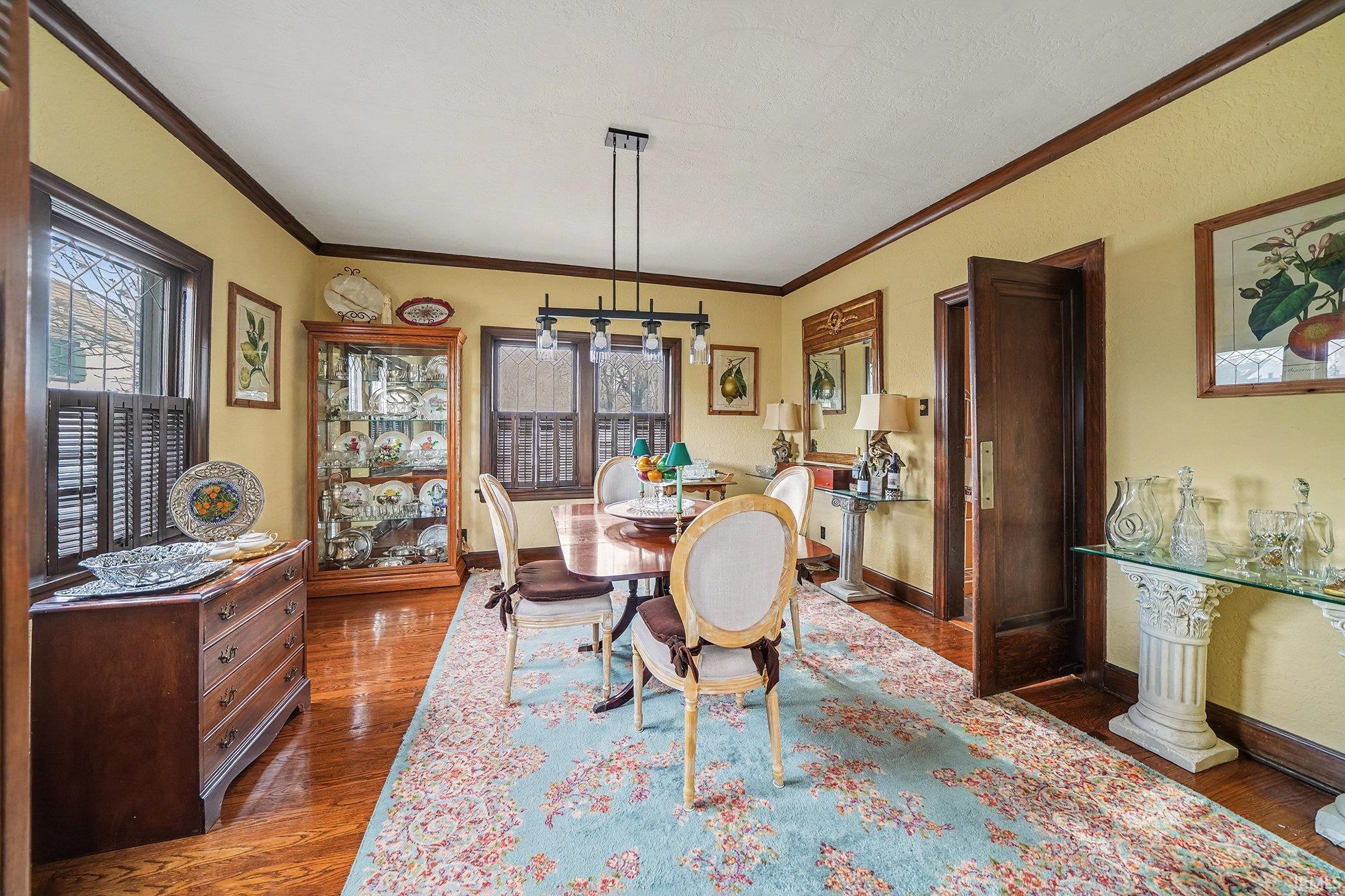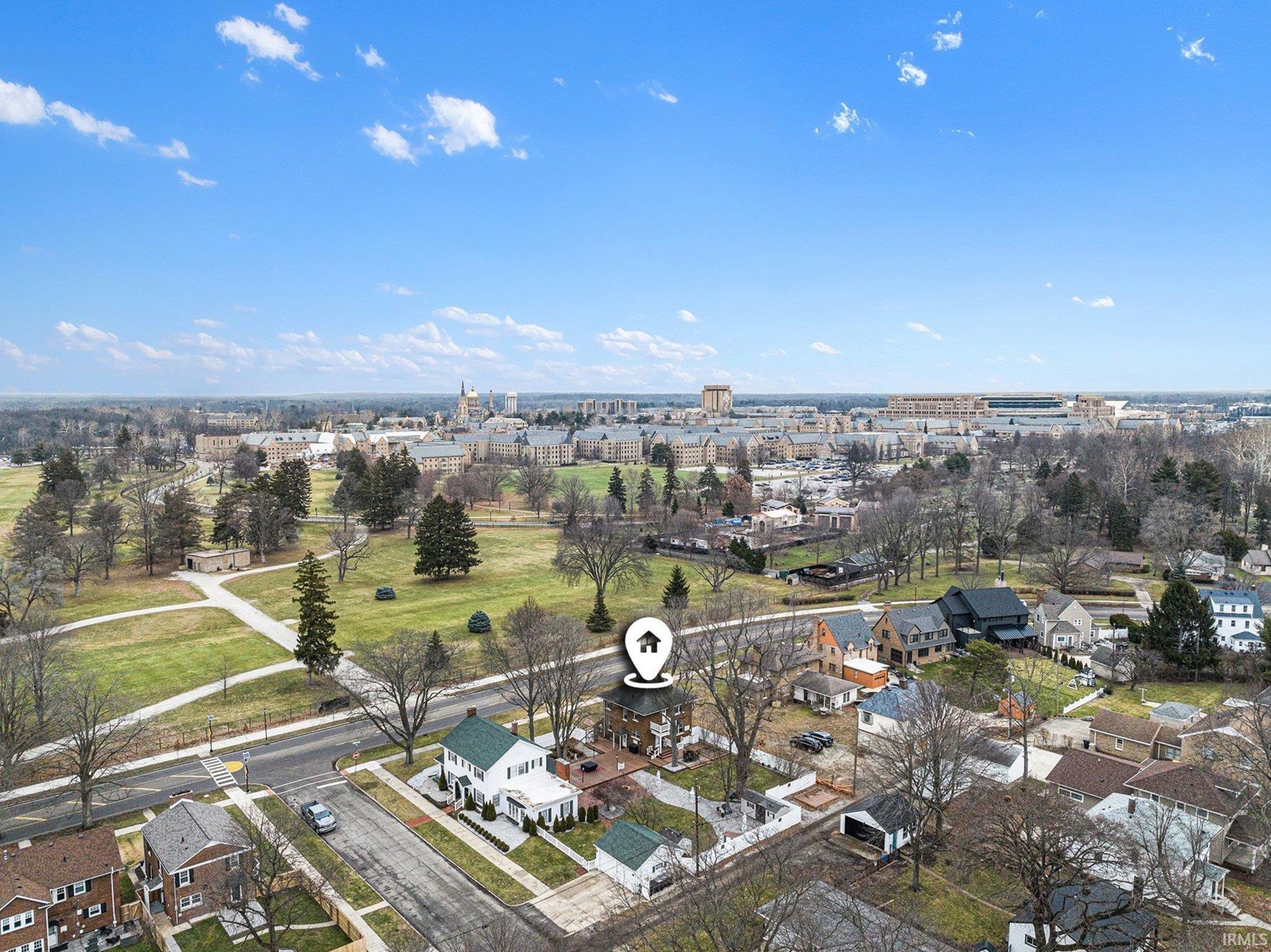 This stunning home’s location puts you, literally steps from the Notre Dame campus. Be a part of Harter Heights, the historic neighborhood with the closest proximity to the Notre Dame campus of any neighborhood in South Bend. Cross the street on the cross-walk-in front of your home, and you are on campus. Breathtaking views of the Golden Dome and the spires of the Basilica from every window on the North and West sides of this home. Sit on your front porch and enjoy your morning coffee or evening cocktail while relishing in these unmatched views of the Golden Dome A welcoming hardwood-floored entrance with a carved wood staircase leads into a warm, sunlit living room, where lead-lined windows offer captivating views of the campus and a brick fireplace serves as a perfect centerpiece. The formal dining room dazzles with its oak hardwood floors, 4-bulb pendant light, and original architectural details. The thoughtfully designed kitchen features tile flooring, dual sinks, a 5-burner gas stove and oven, stainless steel appliances, built-in microwave, blonde cabinetry, a ceiling fan, and a pantry—ideal for both casual meals and entertaining. Throughout the second level, hardwood floors and ceiling fans add comfort and style. Each bedroom offers its own unique vantage point of the Notre Dame campus—with the Golden Dome gleaming just beyond the windows. The hallway linen closet provides extra storage with convenient access. The lower level offers sealed floors, a mosaic-tiled stairway, and ample storage space, providing both functionality and flair. Experience the rare opportunity to own a home that captures the spirit of Notre Dame—both inside and out.