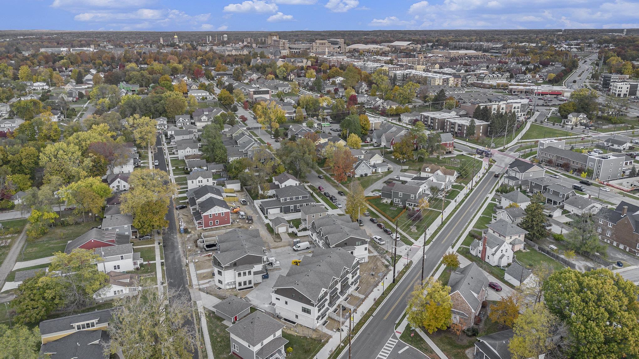 Welcome to Heritage Townhomes. This model unit offers nearly 3400 square feet of brand-new luxury construction in a gated community within walking distance of the University of Notre Dame, with no rental restrictions, and located directly along the new LINK Trail connecting Notre Dame to downtown South Bend. Designed for effortless entertaining, this four-level townhouse delivers a highly intentional layout that shines on football weekends and beyond. The street-level main floor functions as a true tailgate headquarters, featuring an attached two-car garage, a full kitchen, and a half bath—ideal for hosting before and after game day without interrupting the rest of the home. The finished lower level expands the entertainment space with a spacious recreation room, wet bar, full bathroom, and a private bedroom perfect for guests or extended stays. The second floor serves as the primary living level with a generous open-concept living room, dining area, full kitchen, and an additional bedroom with a full bath. The third floor is dedicated to privacy, offering two en suite bedrooms, each with its own full bathroom, along with a conveniently located laundry. High ceilings, quartz countertops, modern cabinetry, and designer finishes elevate the home throughout. Enjoy walkable access to campus, seamless trail connectivity to downtown, and luxury living designed to offer the best of both worlds.