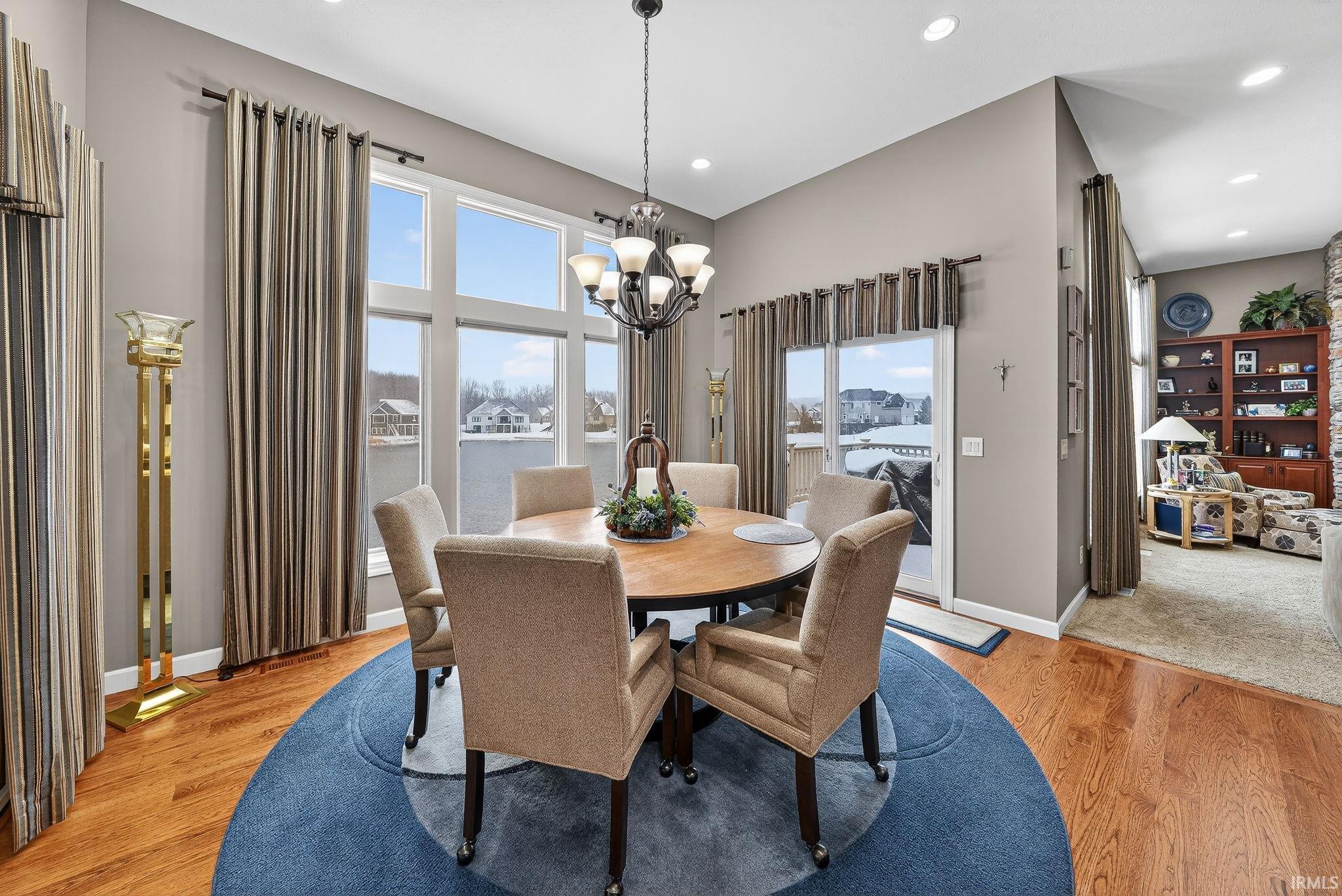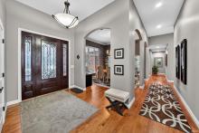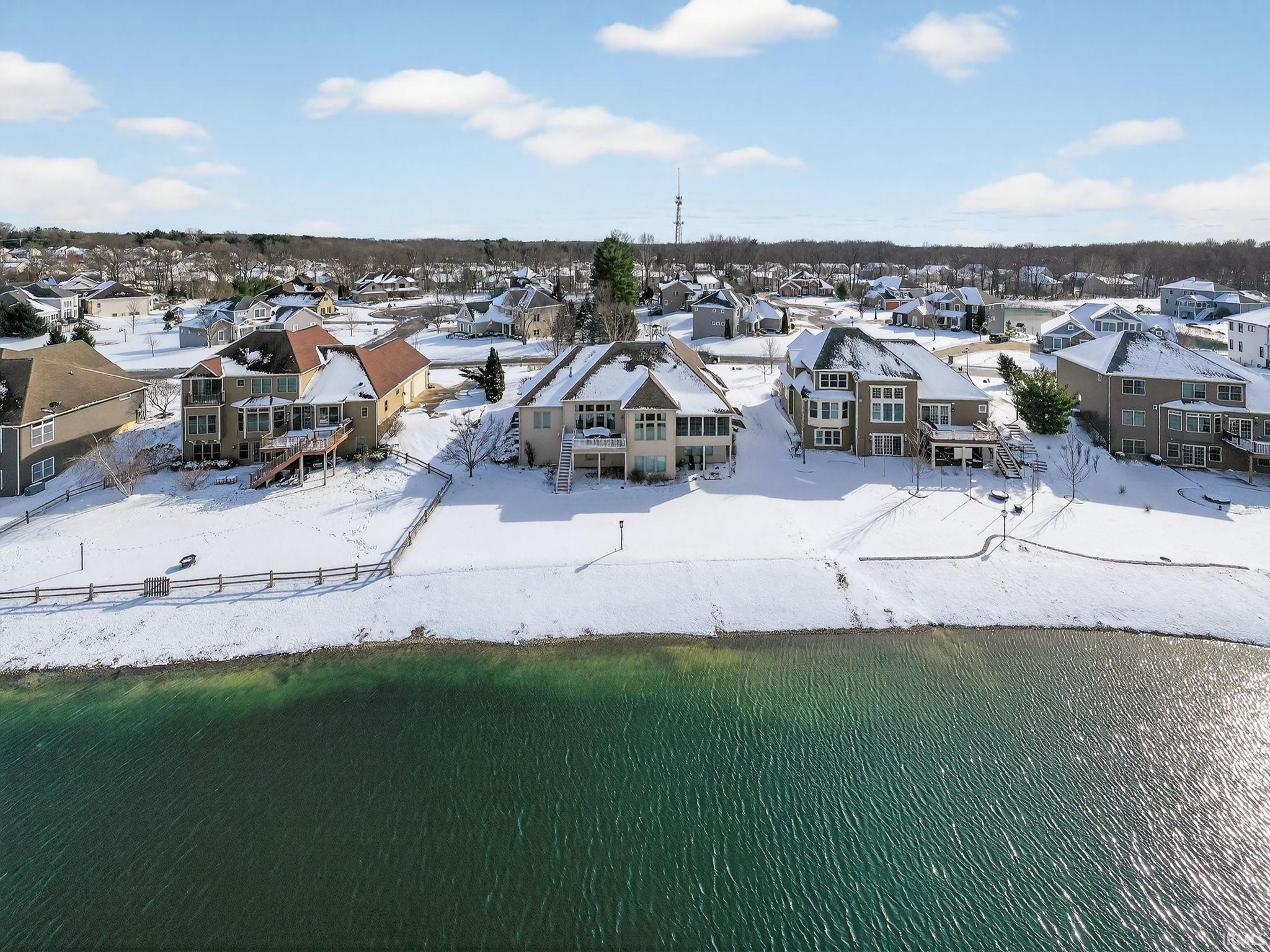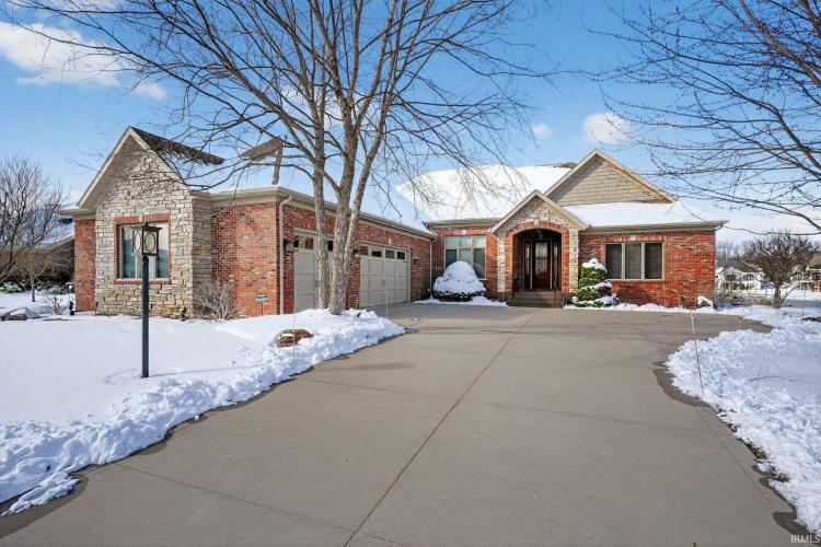 Stunning custom ranch by Nugent Builders in Bradford Shores with beautiful lake views! This brick and stone home offers high-end finishes, 11–12 ft ceilings, and hardwood floors. Open-concept great room flows to a gourmet kitchen, sunroom, and Trex deck overlooking the water. Split floor plan features a luxurious primary suite with tray ceiling, spa-like bath, soaking tub, walk-in shower, and oversized closet. Two additional bedrooms, shared bath, formal dining, and office with water views. Finished walkout lower level includes theater, game area, custom bar, bedroom, and full bath. Smart audio/video by Allegra. Minutes to Notre Dame and Knollwood Country Club.