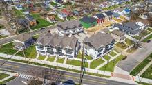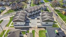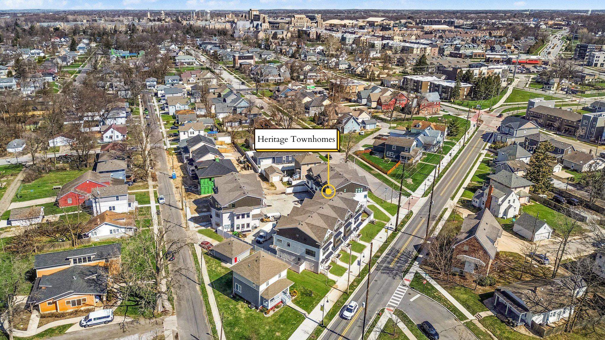 Welcome to Heritage Townhomes. This model unit offers nearly 3400 square feet of brand-new luxury construction in a gated community within walking distance of the University of Notre Dame, with no rental restrictions, and located directly along the new LINK Trail connecting Notre Dame to downtown South Bend. Designed for effortless entertaining, this four-level townhouse delivers a highly intentional layout that shines on football weekends and beyond. The street-level main floor functions as a true tailgate headquarters, featuring an attached two-car garage, a full kitchen, and a half bath—ideal for hosting before and after game day without interrupting the rest of the home. The finished lower level expands the entertainment space with a spacious recreation room, wet bar, full bathroom, and a private bedroom perfect for guests or extended stays. The second floor serves as the primary living level with a generous open-concept living room, dining area, full kitchen, and an additional bedroom with a full bath. The third floor is dedicated to privacy, offering two en suite bedrooms, each with its own full bathroom, along with a conveniently located laundry. High ceilings, quartz countertops, modern cabinetry, and designer finishes elevate the home throughout. Enjoy walkable access to campus, seamless trail connectivity to downtown, and luxury living designed to offer the best of both worlds.